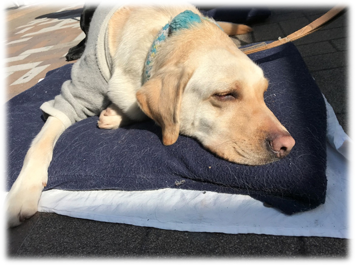 どうも! 僕は介助犬をPRするお仕事をしているんだ。外はポカポカしていてなんだか眠くなってきちゃった。でも疲れているわけじゃないよ! 人通りが多くても、電車が通っても気にせず寝れる性格なんだ! 僕みたいな性格の子が介助犬やPR犬に向いているんだって♪